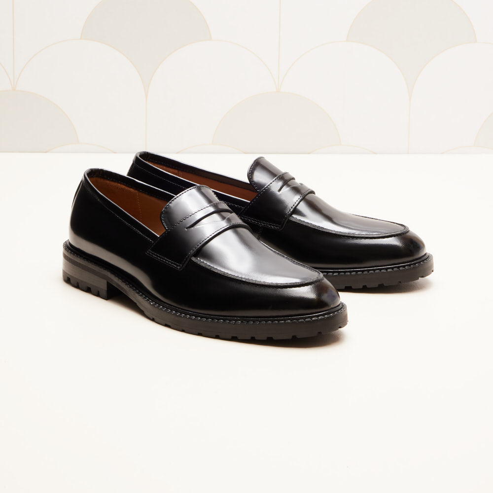 Côté chaussures, les mocassins noirs sont incontournables pour ce style. Vous pouvez opter pour un modèle à glands (pompons) ou de type “penny loafer” en cuir verni pour accentuer le côté BCBG. Par exemple, nos mocassins Avril en cuir glacé noir se prêtent parfaitement à l’exercice. Leur silhouette sobre à bride sur le dessus rappelle le traditionnel mocassin de collège. Portez-les avec des chaussettes blanches hautes ou à motifs discrets (côtelées, à fines rayures, ou avec une bordure overlock) – c’est le détail qui fait mouche et affirme votre look.